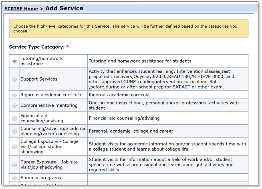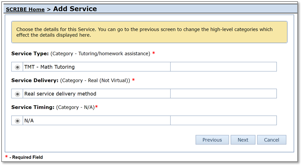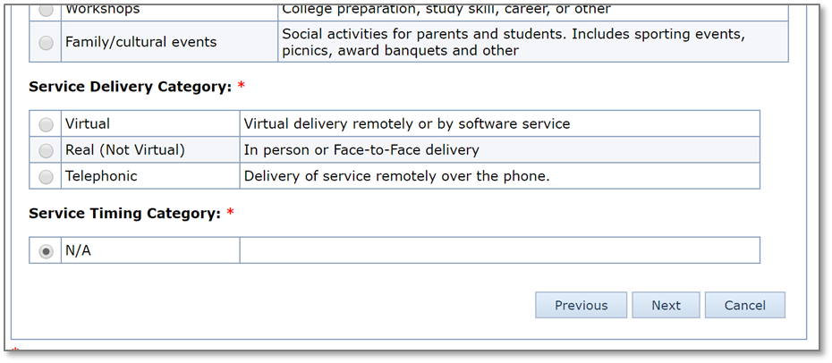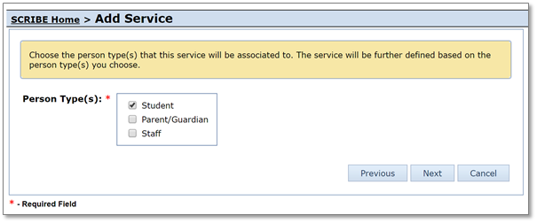 Note: The Service Type Category choices will depend on which person type was selected during the previous step.