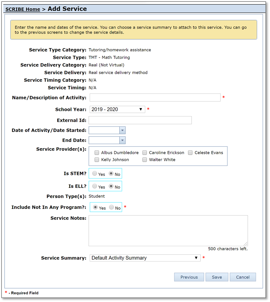 8. Enter the Name/Description of Activity using the proper naming conventions. Copy the Name/Description of Activity and paste it for the External ID. Enter the Start Date and End Date for the service. Click Save.