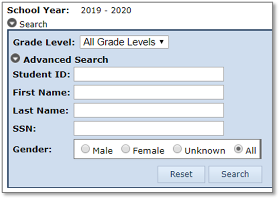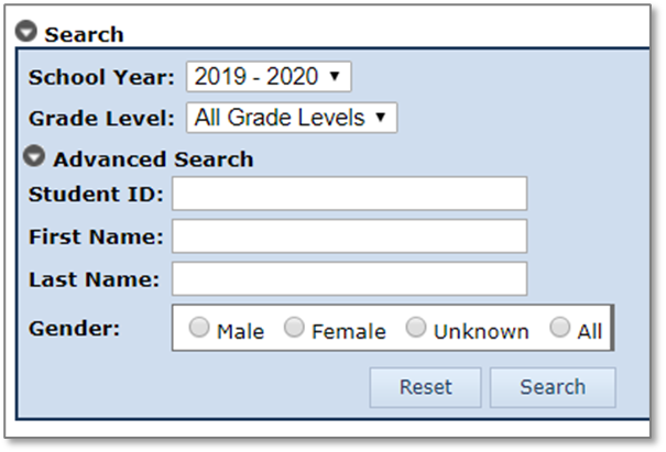 Click the grey circle next to Advanced Search to reveal the Advanced Search Box. The Advanced Search will allow you to further narrow the student list or search for individual students by StudentID, name, gender, etc.