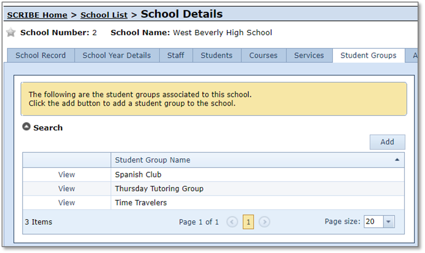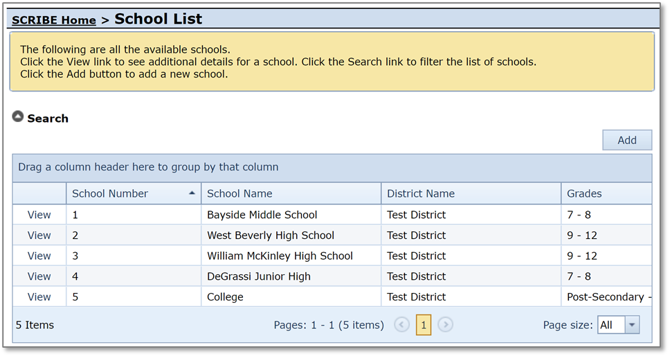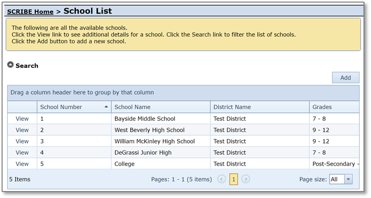 1. From the SCRIBE main menu, click Schools > View All Schools.
