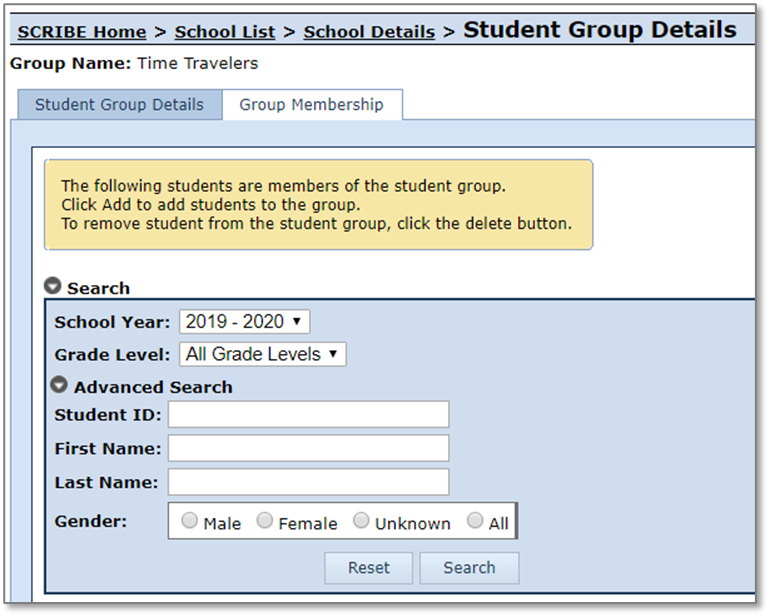 To view group membership or to edit group membership for a school year other than the current school year, click on the Search triangle to uncover the search parameters in the Group Membership tab. Change the School Year from the dropdown menu. Click Search.