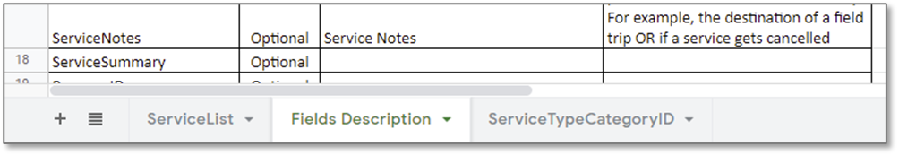 - Open the Service List Import Template in the Google training folder. A link to the import templates can be found in the SCRIBE Manual.