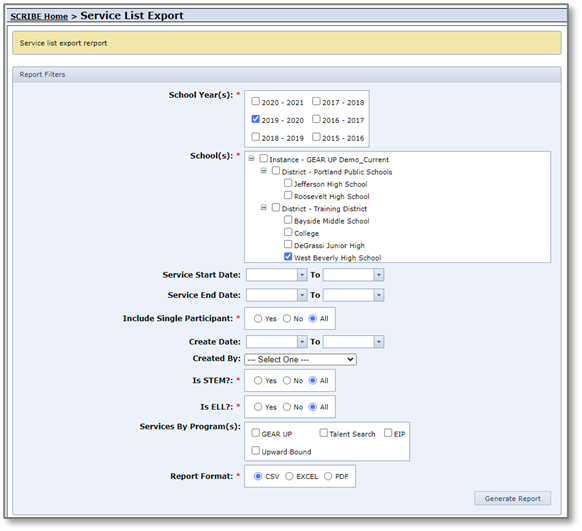 Tip: Under Report Format, select CSV (not Excel) because the field headings (column headings) in the CSV format align more with the field headings required for importing than the excel format (the field headings are the same in both formats, but there are spaces between the words in the excel format – “Service Name” and no spaces between the words in the CSV format – “ServiceName”). Do not select PDF as you will not be able to edit or import a PDF.
