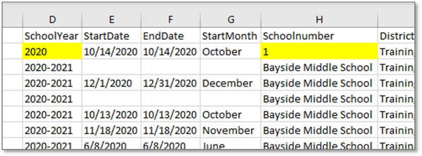 - SchoolYear field in the service list export has the school year listed as “2020-2021” while the Service List Import requires the SchoolYear be written as the first year of the two school years, so “2020” (or 2021 for the 2021-2022 school year, 2022 for the 2022-2023 school year, etc.).